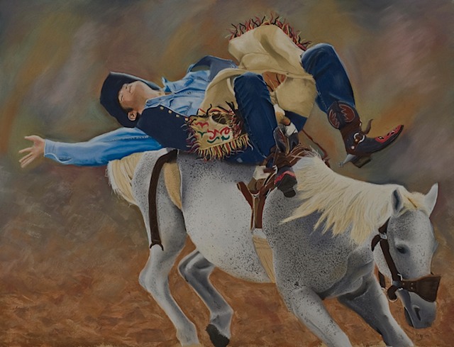 Laying Down on the Job is an 18"x24" painting on LaCarte paper. It is another in my rodeo series. I was particularly drawn to the horse's eye in the reference photo. Unlike many broncos, his eye was very kind. He looked like he knew his job was to buck, but had nothing against the cowboy for doing his job as well.